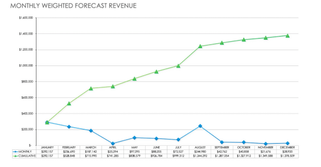 Система відстеження, яку ви використовуєте, не обов’язково повинна бути складною. Наприклад, ви можете створити таблицю Excel і навіть побудувати графіки, як цей від SmartSheet, які допоможуть вам побачити, чи досягають ваші продажі прогнозованого доходу, нижче або вище за нього.